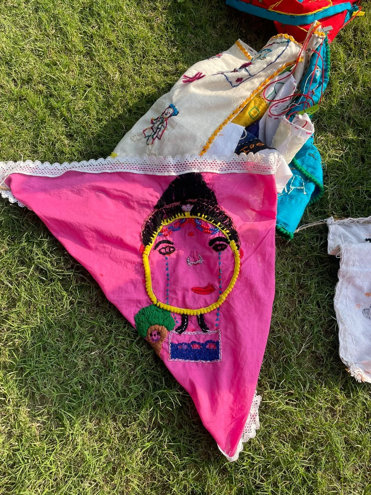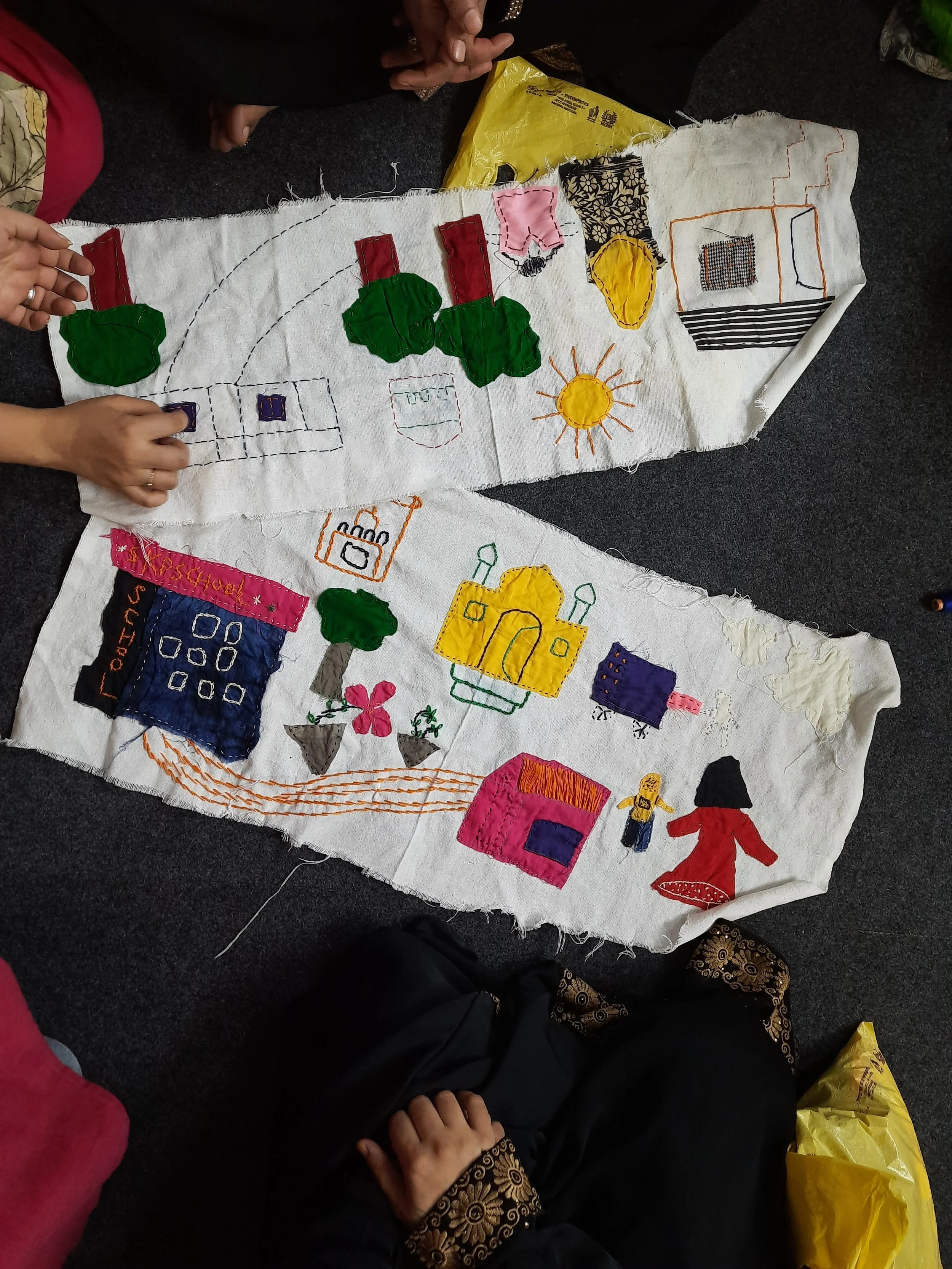 Our sesions are carefully planned usually commencing with icebreakers, then transitioning into theater and movement-based exercises, as well as art warm-ups, leading to stitching and embroidery sessions and finally closing with discussions and conversations around the pieces created during the session.